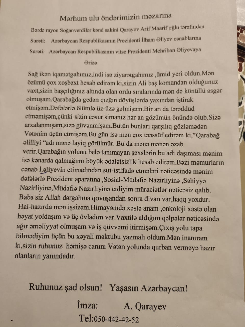 Arif Qarayev bildirir ki, bütün sənədlərinin qaydasında olması baxmayaraq, onun müraciəti rədd edilib. Hətta, vətəndaş bir neçə dəfə Prezident Aparatında görüşdə olub, ancaq problem öz həllini tapmayıb. İş o yerə çatıb ki, o, eks-prezident Heydər Əliyevin məzarına məktub yazıb.