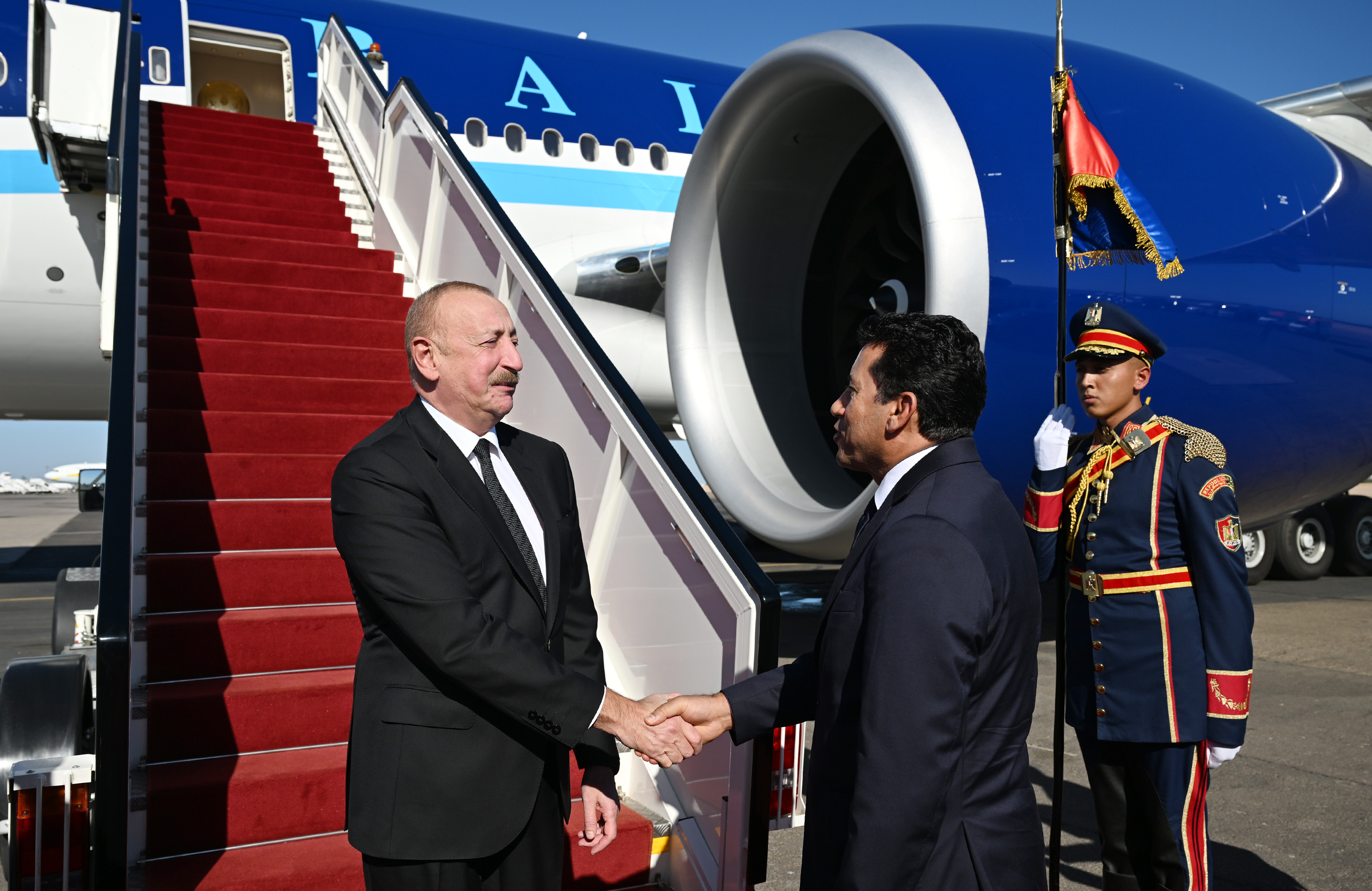 Azərbaycan Prezidentini Misirin gənclər və idman naziri Əşrəf Subhi və digər rəsmi şəxslər qarşıladılar.